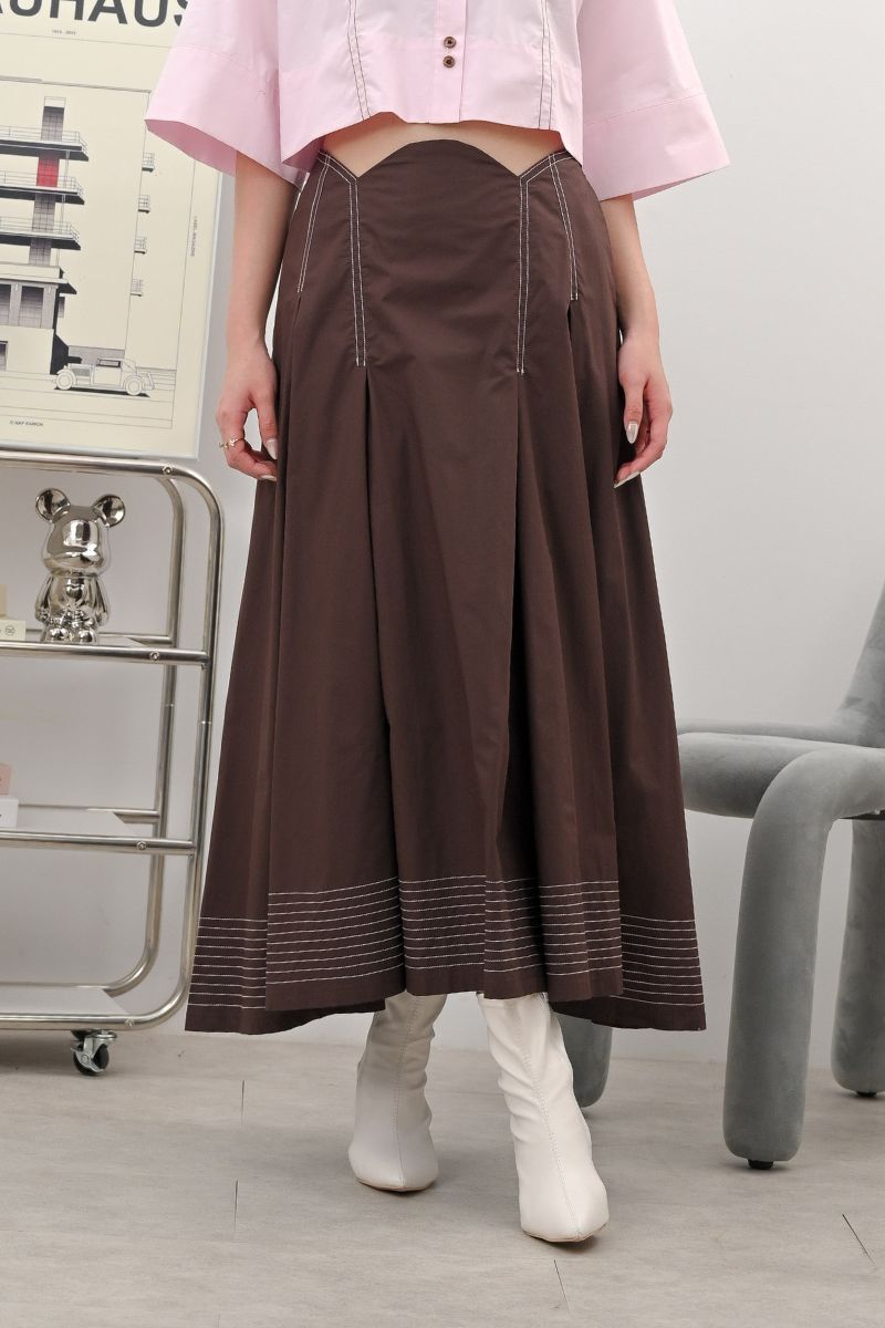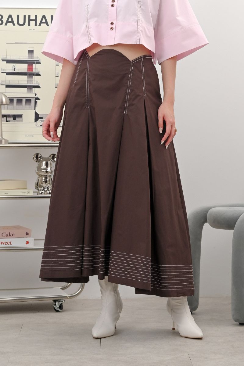 Introduce our Massa Skirt - a chic flared skirt in espresso color, designed with a unique curved waistband that flatters the waistline. Made from soft cotton fabric, it features contrast white stitching and subtle pleats for a clean, modern look. The skirt moves beautifully and pairs perfectly with cropped tops like our Martina Top.