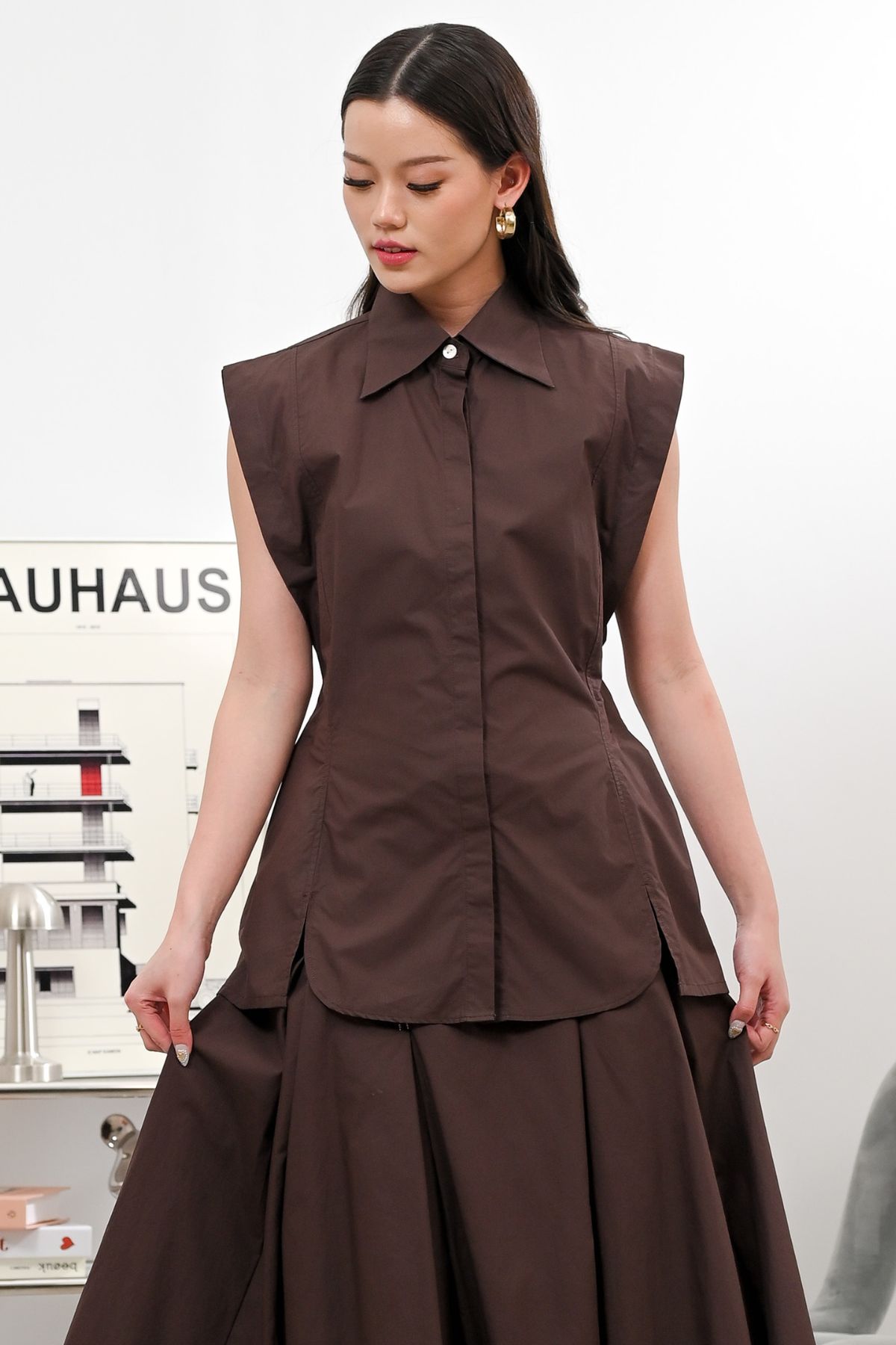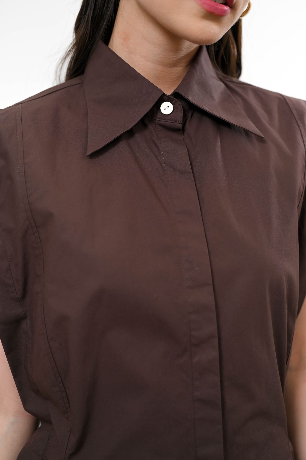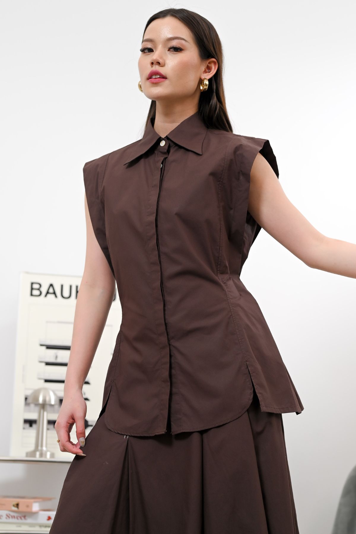Presenting our sleek sleeveless top with a collared neckline and hidden button closure for a clean, modern look. Finished with a flattering fit and curved hem, easy to style for casual or chic outfits. Available in two colors, Espresso and Dark Denim.
