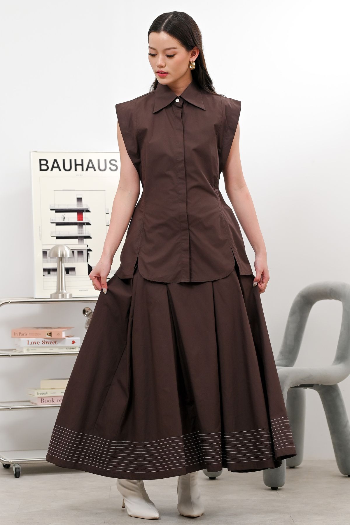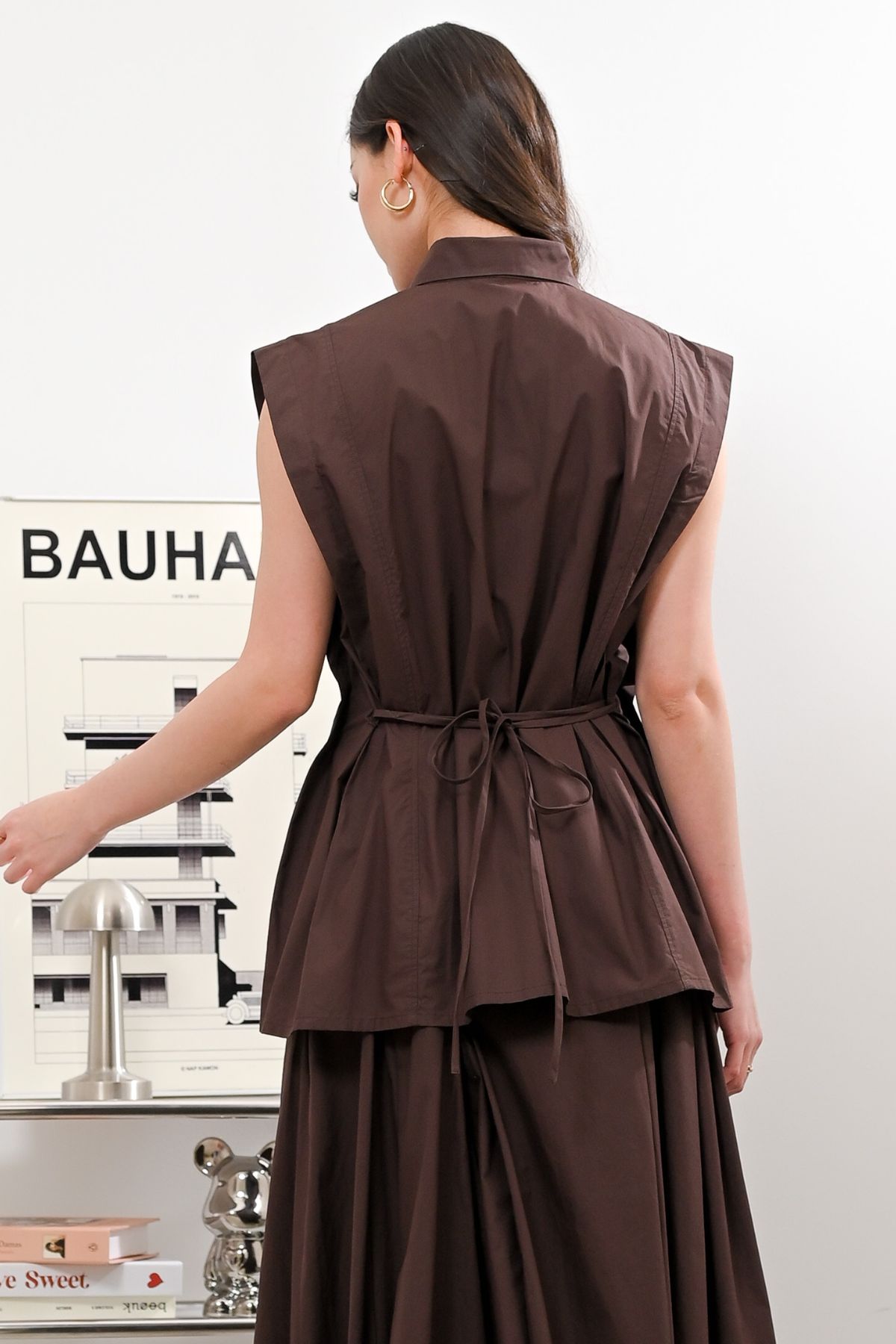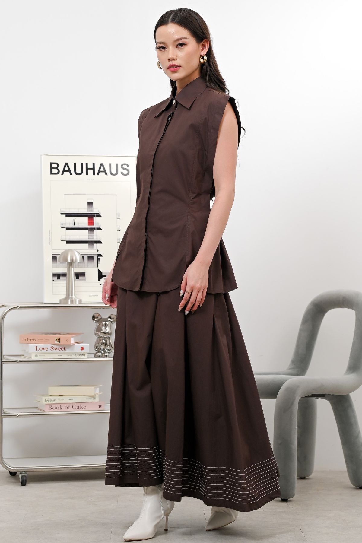 Presenting our sleek sleeveless top with a collared neckline and hidden button closure for a clean, modern look. Finished with a flattering fit and curved hem, easy to style for casual or chic outfits. Available in two colors, Espresso and Dark Denim.